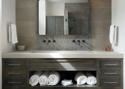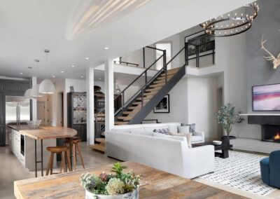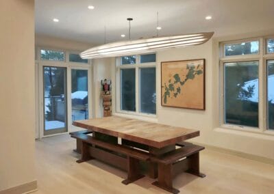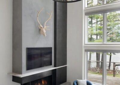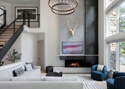 The original design of this lakeside home featured a pseudo-classical European design popular in the 1980s, with high arches, intricate metal balustrades, and solid wooden cabinetry. The lake view from the wall of windows was obstructed by some of the original design elements. The owner wanted a simple, clean design that didn’t distract from the natural beauty that surrounds the home, creating a peaceful retreat for his family.